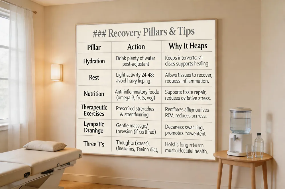 After a chiropractic adjustment, optimal recovery hinges on three pillars: hydration, rest, and nutrition. Drinking plenty of water keeps intervertebral discs supple and aids the body’s natural healing processes, while a balanced diet rich in anti‑inflammatory foods supports tissue repair. Complementary therapeutic exercises and stretches prescribed by your chiropractor reinforce joint alignment, improve range of motion, and reduce post‑adjustment soreness. Many clinics also offer lymphatic drainage—gentle massage or inversion techniques that move fluid through superficial lymph nodes, decreasing swelling and inflammation; ask your provider if they are certified in this service. Addressing the three T’s—thoughts, trauma, and toxins—is essential for long‑term health: stress‑management techniques calm the nervous system, proper body mechanics prevent recurrent micro‑trauma, and an anti‑toxic diet limits harmful chemicals. Research indicates that regular adjustments can lower cortisol levels, further reducing stress‑related tension. Together, these strategies accelerate healing, preserve spinal health, and promote lasting well‑being.