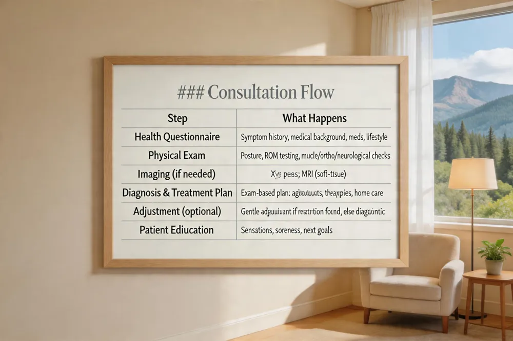 During the first chiropractic appointment you will first complete a health questionnaire that captures your symptom history, medical background, medications, and lifestyle factors. The chiropractor then conducts a focused physical exam that includes a posture analysis, range‑of‑motion testing, muscle tone and strength checks, and orthopedic/neurological tests to locate joint restrictions. Imaging—typically X‑rays and only when indicated by recent trauma, suspected deformity, or red‑flag symptoms—may be ordered to visualize bone structures; MRI is reserved for soft‑tissue concerns. Based on the history, exam findings, and any imaging, the chiropractor diagnoses the underlying issue and creates a personalized treatment plan outlining adjustment frequency, supportive therapies, and home‑care recommendations. Many clinicians will perform a gentle adjustment during this visit if a clear, treatable restriction is identified; otherwise, the first session may remain diagnostic with the adjustment scheduled for the next appointment. Throughout, the practitioner explains expected sensations, possible mild post‑adjustment soreness, and next‑step goals, ensuring you know what to expect and how to maximize results.