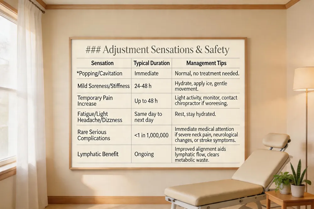 Chiropractors use a controlled, quick thrust—often a Diversified or Activator technique—to adjust a joint; the resulting “popping” is simply cavitation, the release of gas bubbles, and is normal. Most patients notice mild, short‑term effects such as soreness, stiffness, a temporary increase in pain, fatigue, light headaches, or brief dizziness—much like post‑workout muscle fatigue—typically resolving within 24‑48 hours. Staying hydrated, applying ice, and avoiding strenuous activity for a day or two can ease these sensations. In rare instances—occurring in less than one in a million sessions—adjustments may aggravate a herniated disc, cause nerve compression, or, especially with neck manipulations, trigger a stroke; these serious complications require immediate medical attention. The body does not create new toxins after an adjustment; instead, improved alignment enhances lymphatic flow, helping clear metabolic waste such as lactic acid and carbon‑dioxide. If pain worsens, lasts longer than a few days, or feels unusual, contact your chiropractor promptly.