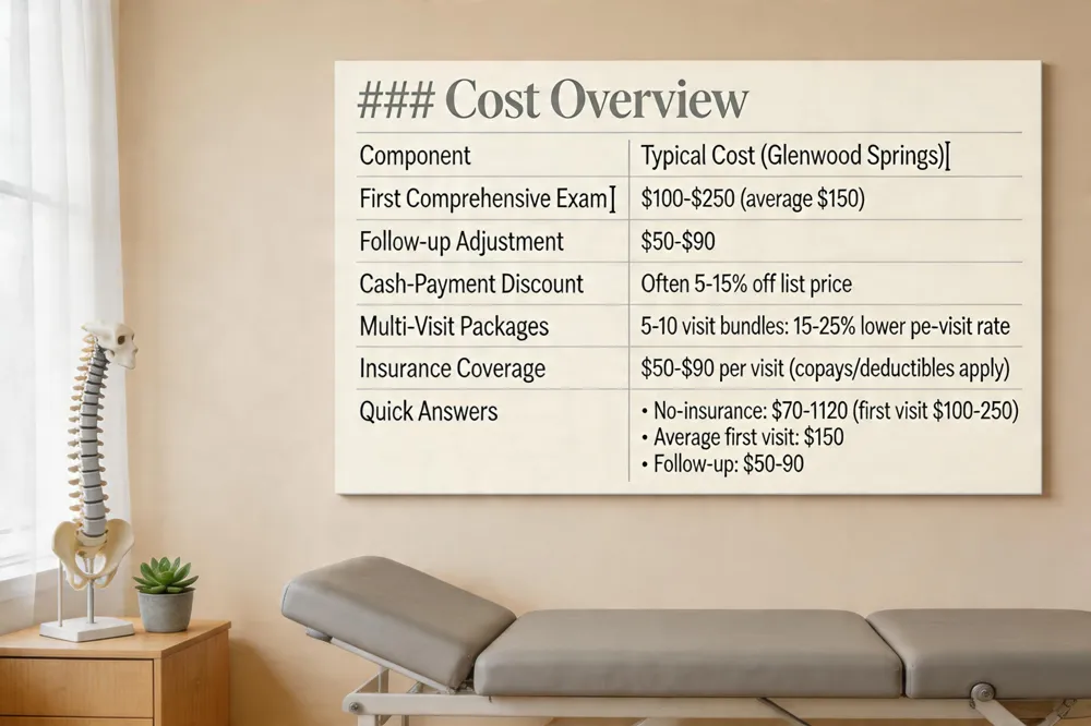 - Chiropractor first visit cost? $100‑$250, averaging about $150 in Glenwood Springs.