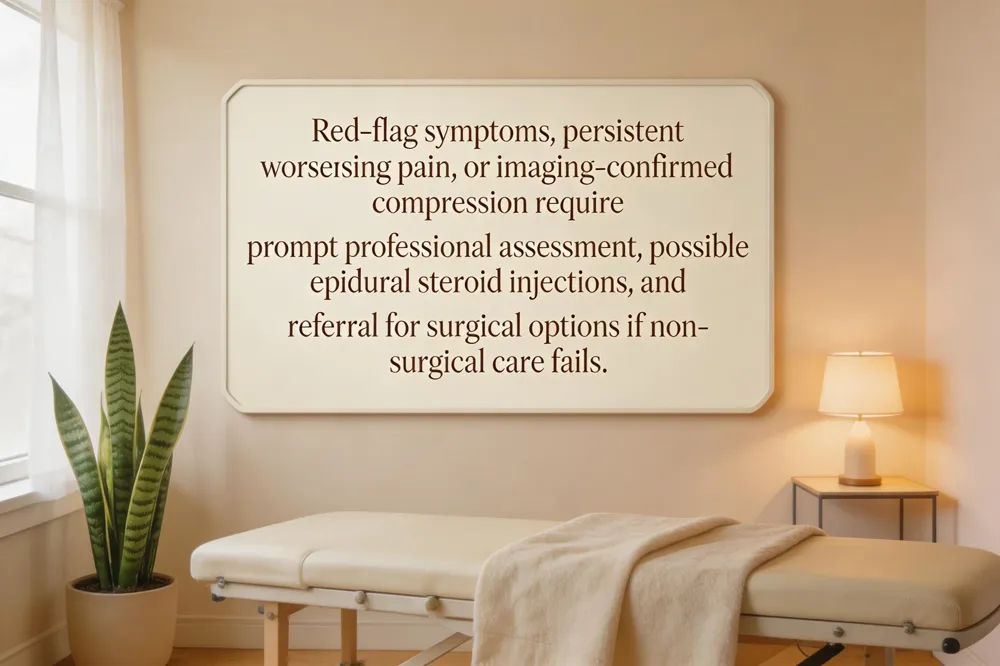 If imaging confirms a compressive lesion and symptoms remain severe or progressive despite exhaustive non‑surgical care—including epidural injections—surgical options such as microdiscectomy, laminectomy, or minimally invasive decompression may be recommended. Surgery is typically reserved for refractory cases because it carries higher risks and recovery time. A multidisciplinary, patient‑centered approach ensures that each step—from red‑flag identification to imaging, injections, and possible surgery—is tailored to the individual’s condition and goals.