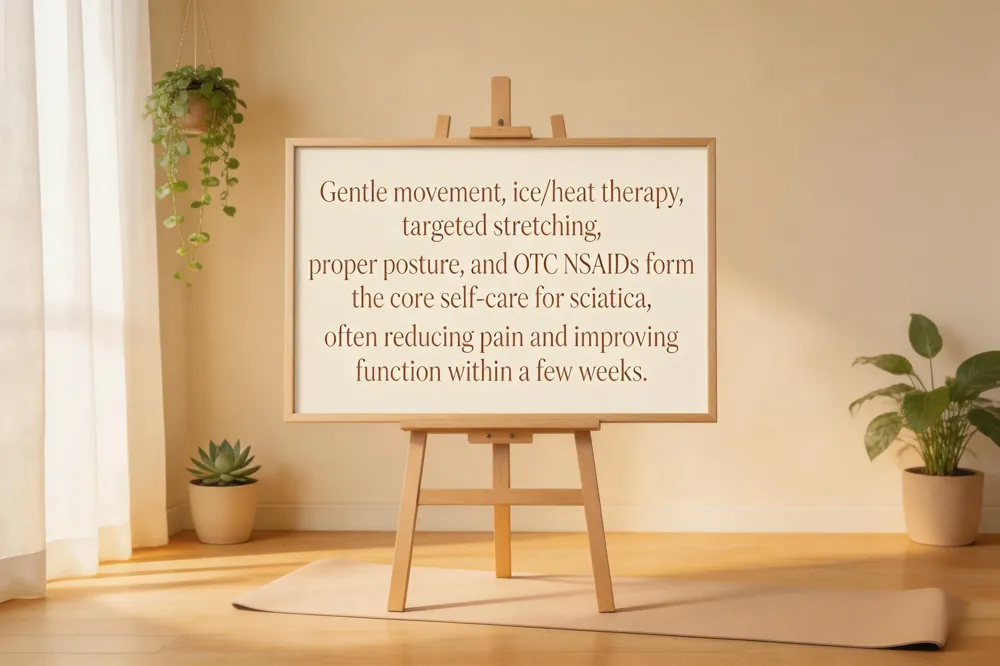 Gentle movement, such as short walks and light stretching, helps keep back muscles from tightening and can reduce pressure on the sciatic nerve. is a cornerstone of sciatica self‑care. Short walks, light housework, or any low‑impact activity keep the back muscles from tightening, promote circulation, and lessen pressure on the irritated sciatic nerve. Most patients notice reduced pain and improved function within a few weeks when movement is performed consistently.