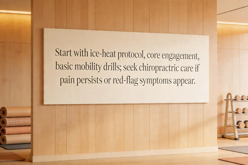 Ice and heat therapy: Apply a thin‑towel‑wrapped ice pack for 15‑20 minutes every 2‑3 hours during the first 48 hours to curb inflammation, then switch to a heating pad for 15‑20 minutes to relax muscles and improve circulation. Gentle stretches & low‑impact movement: Perform knee‑to‑chest, pelvic tilts, or a short walk; swimming and yoga keep the spine mobile without over‑exertion. Micro‑breaks & posture cues: Every 30‑60 minutes, stand, roll shoulders back, and take a brief stretch; use a lumbar roll or rolled towel while seated and place a pillow under the knees (back‑sleep) or between the knees (side‑sleep) to maintain neutral curves. When to seek professional help: If pain persists beyond a few days, worsens, or is accompanied by numbness, fever, or loss of function, schedule a chiropractic evaluation for targeted adjustments and personalized rehab.