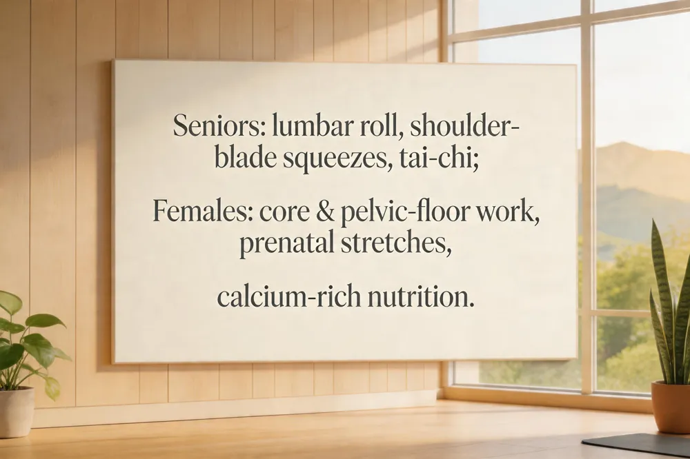 Female lower back pain treatment: Begin with gentle spinal adjustments to restore joint motion and reduce tension. Add core‑strengthening and pelvic‑floor exercises, especially during pregnancy or postpartum, and use heat or ice as needed. Include prenatal‑specific stretches, proper footwear, and nutrition rich in calcium and vitamin D to support bone health.