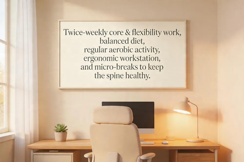 Maintaining a healthy back for later life hinges on regular core‑strengthening and flexibility work (planks, bird‑dogs, hip‑flexor stretches) performed at least twice weekly, combined with a balanced diet and aerobic activity to keep weight in a healthy range. An ergonomic workstation—chair with lumbar support, monitor at eye level, feet flat on the floor—reduces spinal strain, while micro‑breaks every 30‑60 minutes reset posture. Good posture examples: standing with ears over shoulders, knees slightly bent; sitting with lumbar support, knees at 90°, feet flat; walking with head up and balanced stride. At home, use a rolled towel or lumbar pillow, keep screens at eye level, and set a timer for brief walks. Posture correctors can remind you to sit upright but should be paired with targeted strengthening; they do not replace exercise or bone‑health measures for osteoporosis, though they aid alignment and fall prevention.