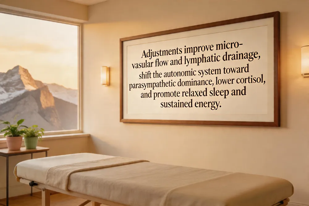 By decreasing nerve interference and muscle strain, adjustments shift the autonomic balance toward the parasympathetic (rest‑and‑digest) state. This hormonal shift lowers circulating cortisol and other stress hormones, curbing the catabolic effects of chronic stress that drain vitality. Patients often notice a calm, light sensation after an adjustment because endorphins are released and cortisol drops, promoting relaxation and improving sleep quality.