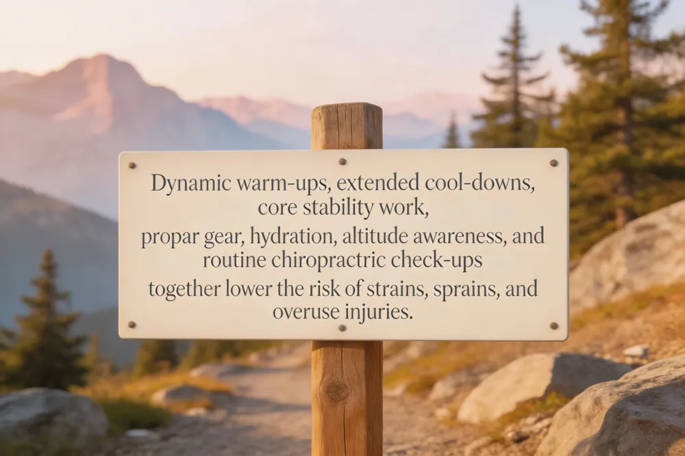 Choose sport‑specific, well‑fitted footwear and protective gear (helmets, pads, braces) to reduce joint stress. At 7,800 ft, dehydration and reduced oxygen availability accelerate fatigue; athletes should sip electrolyte‑rich fluids before, during, and after activity, and allow extra recovery time for altitude‑related muscle strain. Regular chiropractic assessments every 4‑6 weeks keep spinal alignment optimal, identify early biomechanical imbalances, and provide personalized mobility guidance.