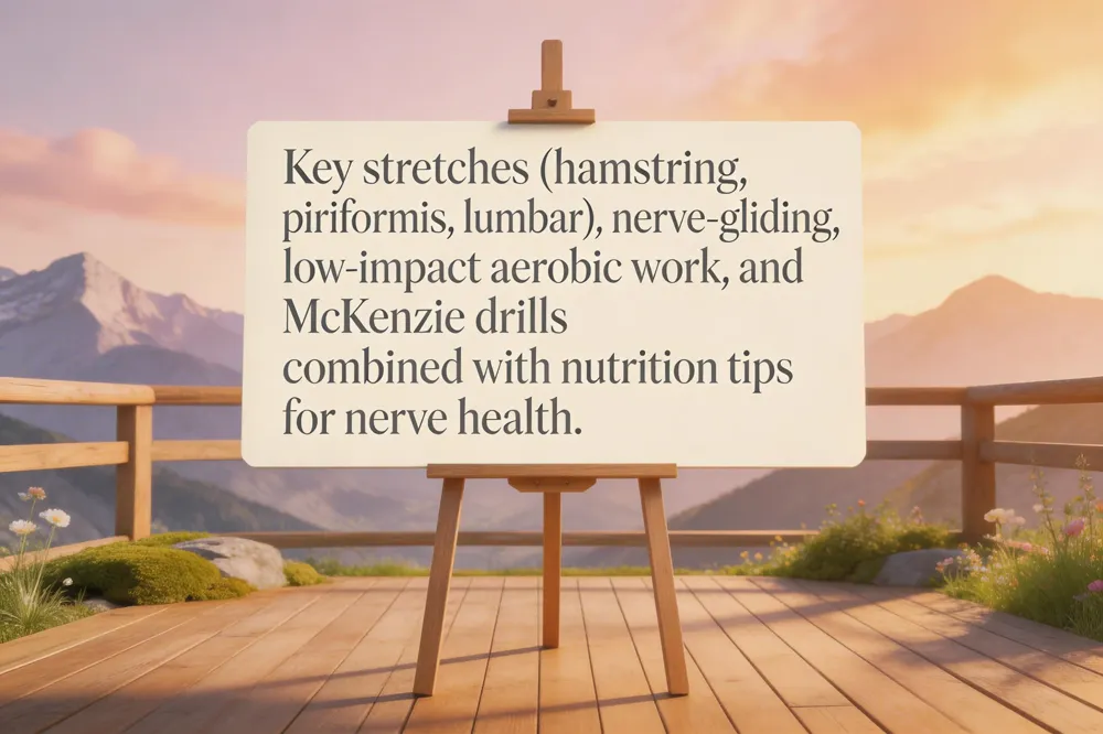 Effective sciatica care begins with gentle hamstring, piriformis, and lumbar stretches—such as the seated hamstring stretch, supine piriformis stretch, and knee‑to‑chest—to release tension on the nerve pathway. Complementary nerve‑gliding (neural flossing) techniques, performed slowly and pain‑free, promote nerve mobility while surrounding tissues heal. Low‑impact aerobic activity, like brisk walking or stationary cycling, improves circulation and reduces inflammation without stressing the lower back. The McKenzie method’s controlled extension and flexion drills—prone press‑ups, standing lumbar extensions, and repeated flexion‑based movements—can centralize leg pain and restore spinal motion.