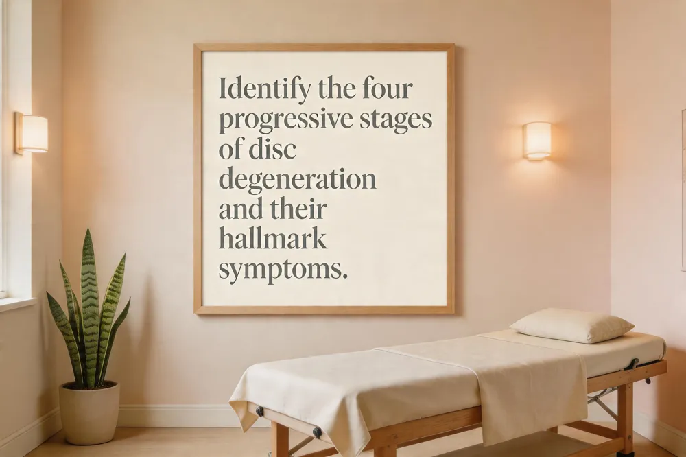 Degenerative disc disease progresses through four recognizable stages. Stage 1 (early) – mild loss of disc height, occasional low‑back discomfort, minimal functional limitation. Stage 2 (moderate) – noticeable disc space narrowing, more frequent pain, and a small bulge or annular fissure that may irritate nearby nerves. Stage 3 (advanced) – significant height loss, chronic pain, nerve irritation, and early spinal stenosis or facet‑joint arthritis. Stage 4 (severe) – disc collapse, marked spinal canal narrowing, persistent disability, and often the need for surgical consultation.