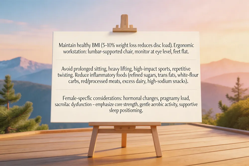 Anti‑inflammatory diet: emphasize whole grains, colorful produce, lean proteins, healthy fats, and stay well‑hydrated (8‑10 glasses water/day). Avoid processed foods, trans fats, and excess alcohol to reduce pain flare‑ups and support disc health.