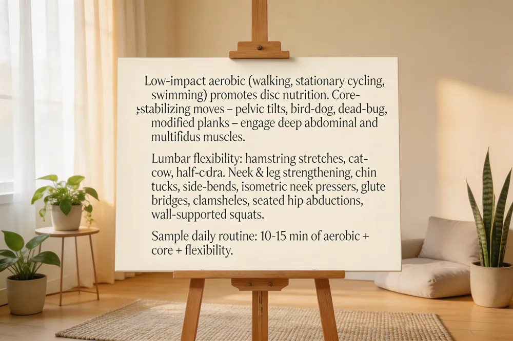 Low‑impact aerobic activities such as walking, stationary cycling, or swimming keep the lumbar muscles active while delivering blood flow and nutrients to the avascular discs. Core‑stabilizing moves—pelvic tilts , bird‑dog , dead‑bugs , and modified planks—engage the deep abdominal and multifidus muscles, creating a solid foundation that reduces disc compression. Lumbar‑specific movements like gentle hamstring stretches (passive or assisted), cat‑cow spinal mobilizations , and low‑intensity back‑extension (half‑cobra) improve segmental flexibility and maintain disc height. Neck and leg strengthening routines round out the program: chin tucks , side‑bends, and isometric neck presses support cervical discs, while glute bridges , clamshells , seated hip abductions, and wall‑supported squats reinforce the posterior chain without loading the spine.
