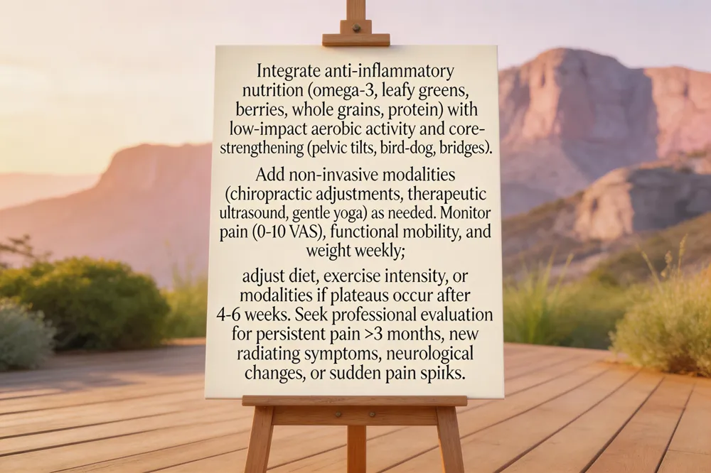Monitoring progress and adjusting the plan – Track pain levels, functional mobility (e.g., distance walked, ability to perform daily tasks), and body‑weight changes weekly. Use a simple visual analog scale (0‑10) for pain and a functional questionnaire (e.g., Oswestry Disability Index) to gauge improvement. If pain plateaus or functional gains stall after 4–6 weeks, revisit the nutrition profile (increase anti‑inflammatory foods, ensure 2‑3 L of water daily), modify exercise intensity (add gentle flexibility work or reduce load), and consider adjunctive modalities such as therapeutic laser or targeted soft‑tissue release.