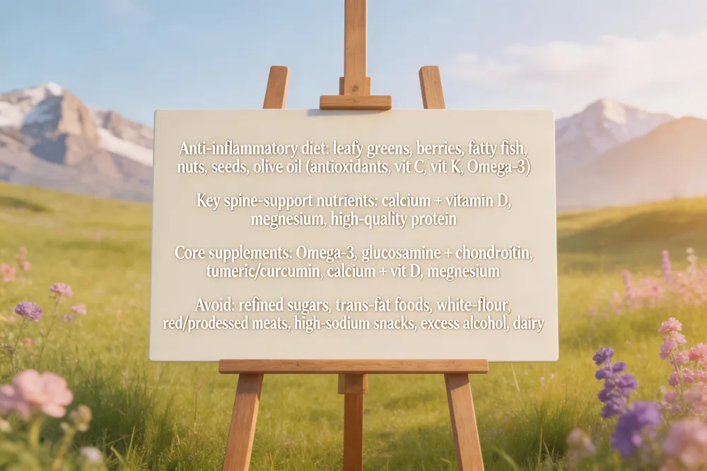 A diet that tames systemic inflammation is a cornerstone of non‑surgical DDD management. Anti‑inflammatory foods such as leafy greens (spinach, kale), berries (blueberries, pomegranate), fatty fish (salmon, mackerel), nuts, seeds and olive oil supply antioxidants, vitamin C, vitamin K and Omega‑3 fatty acids that protect disc cells from oxidative stress. Key nutrients for spine health include calcium and vitamin D for vertebral bone density, magnesium for muscle relaxation, and high‑quality protein to support the connective‑tissue matrix.