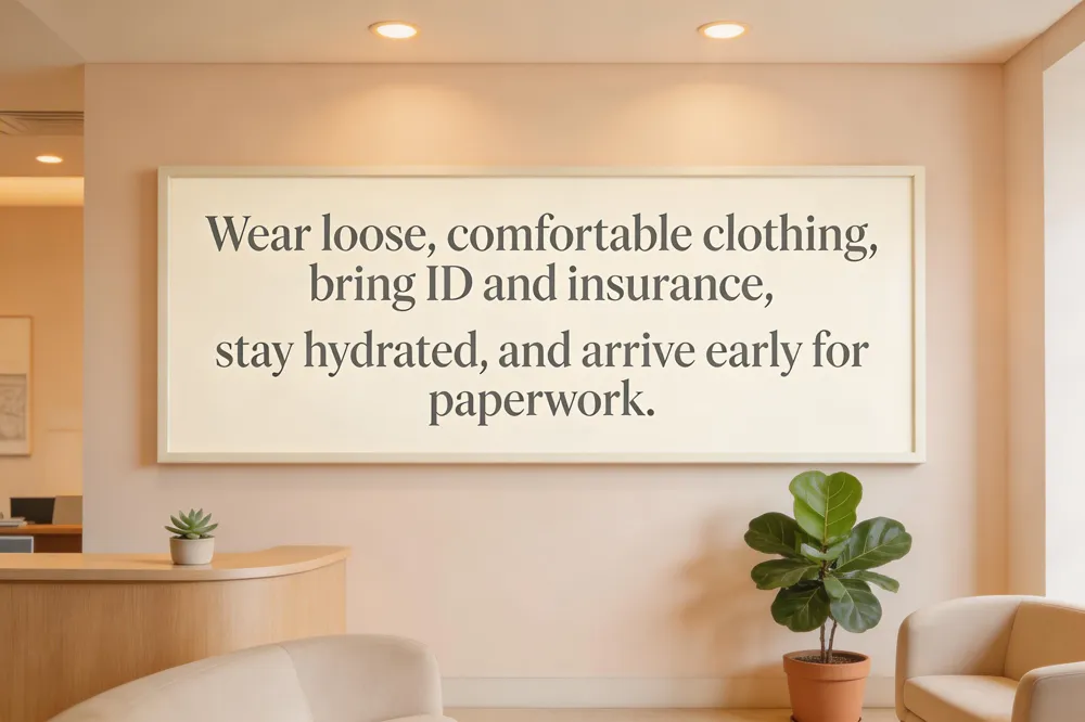 Pre‑appointment checklist: bring photo ID, insurance information, and relevant medical records or prior imaging. Arrive 10‑15 minutes early to complete paperwork and review your symptom history. Stay well‑hydrated before and after the visit, but skip heavy meals and vigorous exercise right before the appointment. A light snack e.g., a piece of fruit or a small yogurt a a few hours prior is ideal.