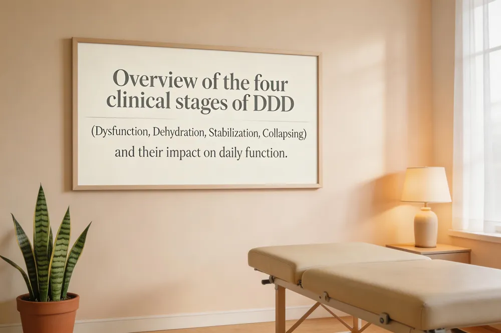 The first stage, called the Dysfunction Stage, involves early structural changes in the disc and a slight alteration of spinal curvature, usually without any noticeable pain. In the Dehydration Stage, the disc loses water, becomes thinner, and may begin to bulge, producing mild to moderate back discomfort that worsens with prolonged sitting or activity. The Stabilization Stage is marked by significant disc‑height loss, formation of osteophytes (bone spurs), and increased pressure on nearby nerves, leading to more persistent pain and occasional radiating symptoms. Finally, the Collapsing (or Severe Degeneration) Stage features advanced loss of disc height, extensive bone spur growth, and possible nerve compression, resulting in chronic pain, stiffness, and functional limitation.