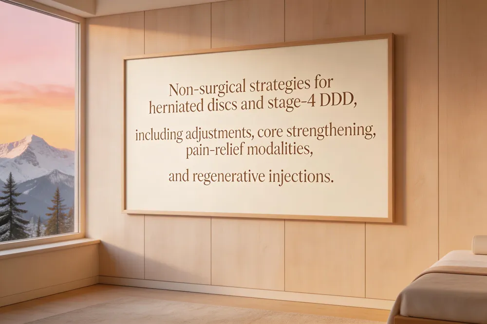 What treatments are recommended for stage 4 degenerative disc disease? A comprehensive non‑surgical plan includes spinal decompression, precise chiropractic adjustments, and regenerative injections such as PRP or stem‑cell biologics to promote repair. Integrated rehab—core strengthening, motor‑control exercises, and manual therapy—supports functional recovery. Lifestyle counseling on ergonomics, activity modification, and nutrition helps prevent further degeneration.