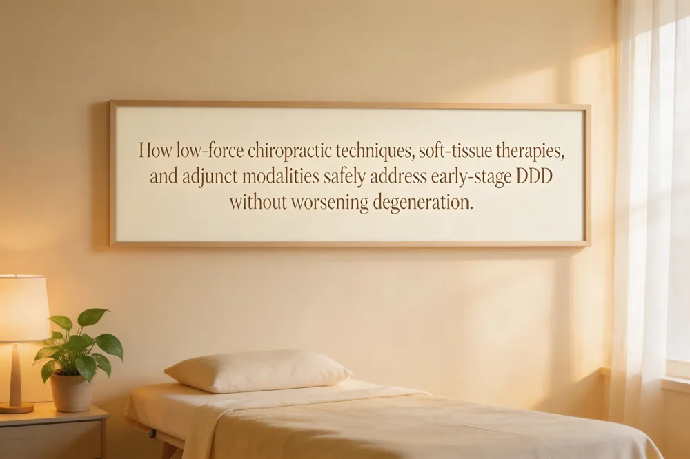 Degenerative disc disease (DDD) is managed through a thorough clinical evaluation that may include imaging (X‑ray, MRI) to confirm spinal stability and rule out severe herniation. Once cleared, chiropractors employ gentle, low‑force techniques—such as flexion‑distraction, instrument‑assisted manipulation, or light thrusts—to restore joint mechanics and relieve nerve irritation without stressing the disc. Soft‑tissue therapies (massage, trigger‑point release, Graston technique) relax surrounding musculature, improve circulation, and reduce inflammatory mediators. Adjunct modalities like spinal decompression, low‑level laser, and TENS further decompress disc space and modulate pain signals. A personalized home‑exercise program emphasizing core stabilization, posture, and low‑impact aerobic activity supports disc hydration and long‑term function. When performed by a qualified practitioner who tailors treatment to the patient’s imaging and symptom profile, chiropractic care is generally safe for early‑stage DDD and does not worsen degeneration; aggressive thrusts are avoided in cases of severe instability or nerve compromise.