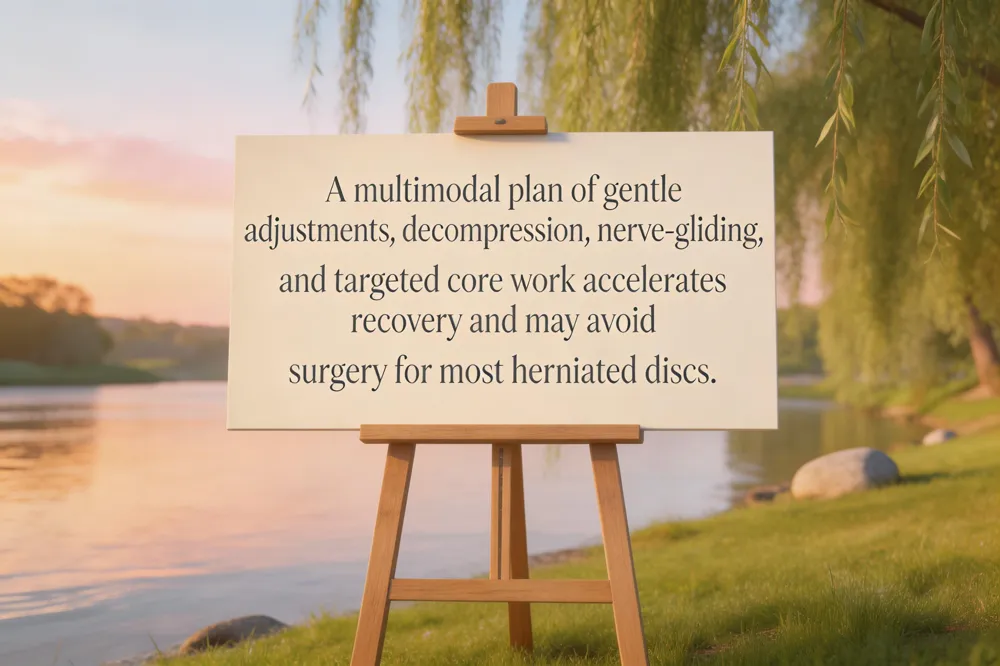 Treatment for herniated disc and sciatica A multimodal chiropractic plan starts with gentle spinal adjustments and spinal decompression, supplemented by core‑strengthening, nerve‑gliding, TENS, massage, and anti‑inflammatory nutrition.