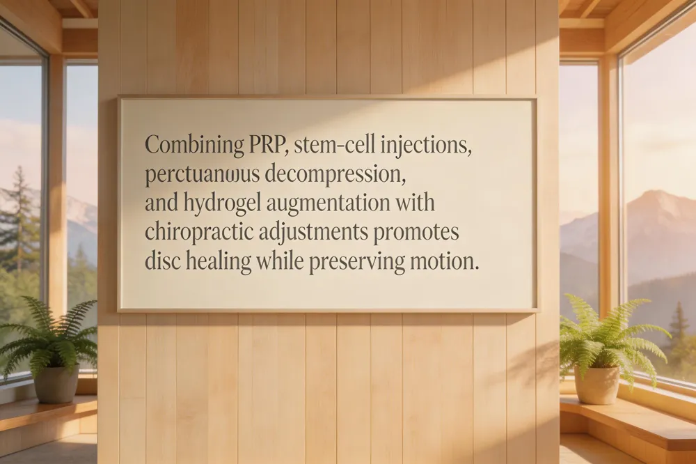 New treatments for degenerative disc disease aim to preserve motion and stimulate healing rather than fuse the spine. Regenerative options such as platelet‑rich plasma (PRP) and autologous stem‑cell injections reduce inflammation and promote disc repair. Minimally invasive procedures—including percutaneous spinal decompression, intradiscal electrothermal therapy, and hydrogel nucleus pulposus augmentation—provide cushioning without large incisions. At our Glenwood Springs clinic we combine these evidence‑based modalities with chiropractic adjustments for a non‑surgical plan.
