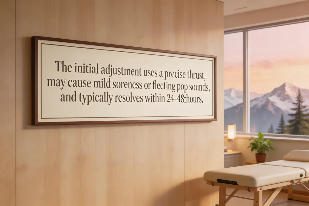 Most patients report only mild, short‑lasting reactions after the adjustment. Common side effects include muscle or joint soreness that feels similar to a light workout, occasional headache, light‑headedness, or a brief feeling of fatigue; these typically resolve within 24‑48 hours with hydration and gentle movement. Rarely, bruising or a slight increase in pain at the treated area can occur, yet serious complications such as herniated disc worsening or vertebral‑artery injury are extremely rare (less than one in a million).