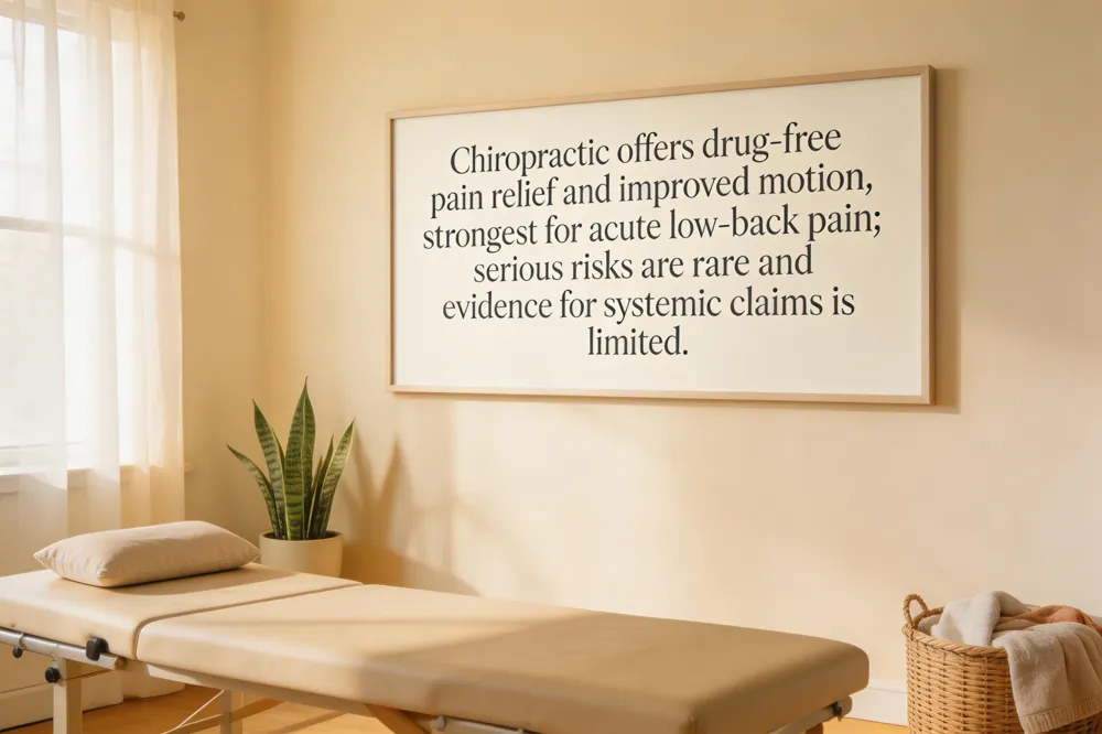 Chiropractic care offers drug‑free pain relief, improved range of motion, and enhanced function for common musculoskeletal complaints such as low‑back, neck, and joint pain. Sessions are typically short, inexpensive, and can help prevent future injuries while providing education on posture and lifestyle. However, the evidence base is strongest for acute low‑back pain, and chronic pain may benefit from chiropractic for upper‑body mixed relief, and practice is modest when long‑term results are desired. Potential downsides include temporary post‑adjustment soreness, rare serious events such as vertebral‑artery injury or worsening of disc pathology, and higher overall cost when many visits are needed.