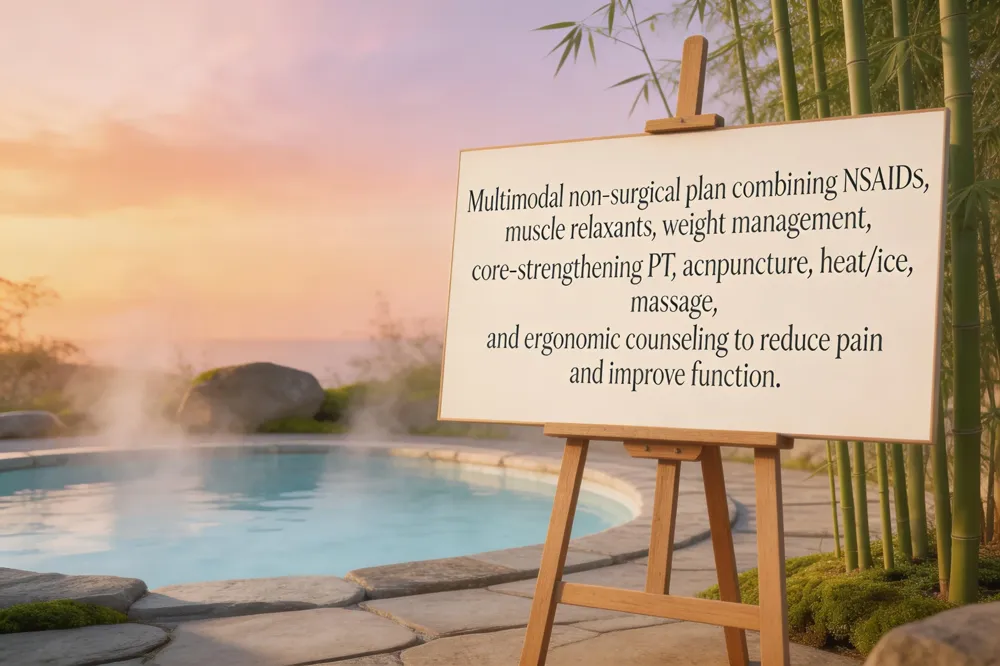 The overarching goal of conservative management is to control inflammation, reduce nerve irritation, restore functional mobility and slow further degeneration. This is achieved through core‑strengthening programs, ergonomic counseling, weight‑management, spinal decompression, manual therapies and, when appropriate, short‑course anti‑inflammatories or oral corticosteroids. By addressing the whole person—physical, biomechanical and psychosocial factors—non‑surgical strategies aim for long‑term symptom improvement and enhanced quality of life.