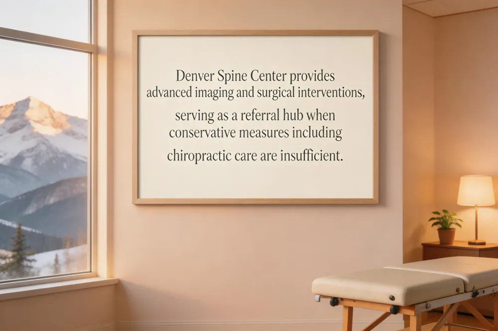 The Denver Spine Center, located at 1721 E. 19th Ave., Suite 500, Denver, CO 80218, serves as a regional hub for both non‑surgical and surgical spine care. Its services include advanced imaging (MRI, CT, X‑ray) and a full suite of surgical interventions such as spinal fusion, decompression, endoscopic procedures, and minimally invasive techniques performed by board‑certified orthopedic surgeons and neurosurgeons like Dr. Timothy R. Kuklo and Dr. Jens‑Peter Witt. Patients can schedule an evaluation by calling (303) 762‑3472. While the center excels in offering high‑tech diagnostics and operative options, it does not provide the chiropractic‑focused, hands‑on therapies (adjustments, flexion‑distraction, therapeutic massage, acupuncture) that are the cornerstone of care at Glenwood Chiro in Glenwood Springs. Consequently, the Denver Spine Center fits into a conservative‑to‑surgical pathway as the referral destination when conservative management—core strengthening, weight‑management, chiropractic adjustments, and complementary modalities—fails to achieve lasting relief or when imaging reveals structural issues requiring operative correction.