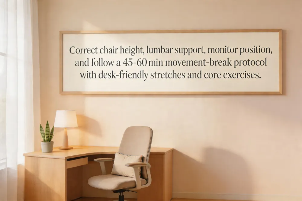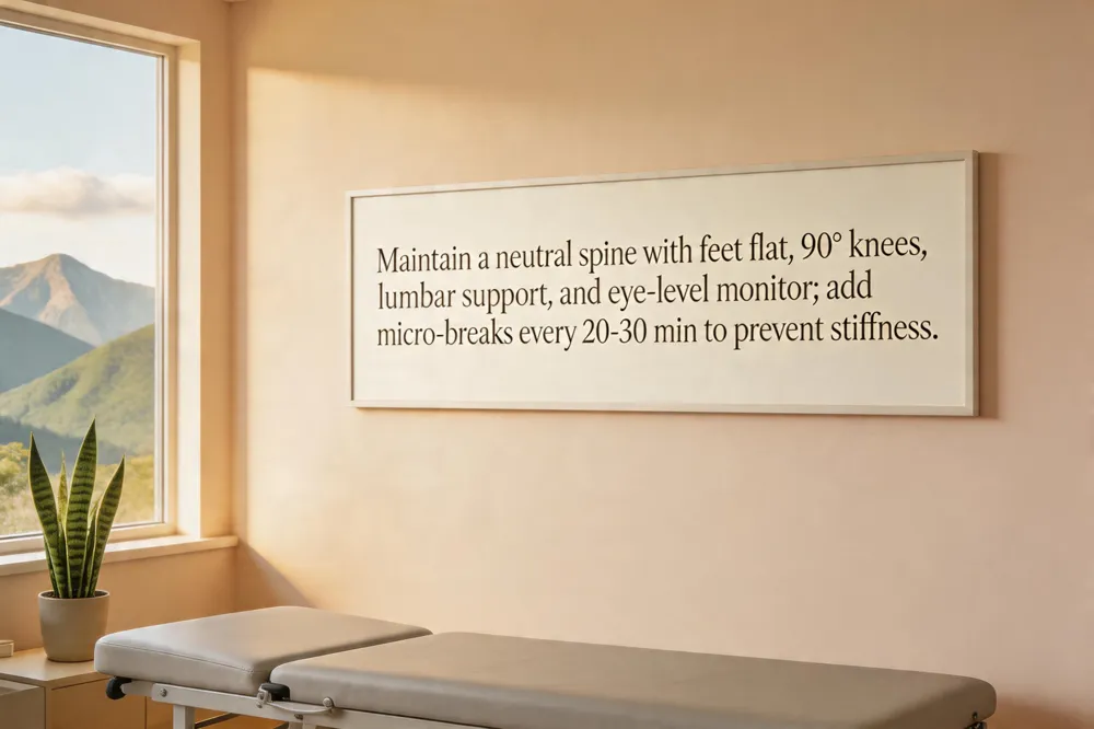 Movement‑break protocol is essential. Every 45‑60 minutes, stand for 1–2 minutes, walk, or perform a quick stretch (e.g., shoulder rolls, neck side bends). This micro‑break restores circulation, reduces disc pressure, and prevents muscle fatigue.