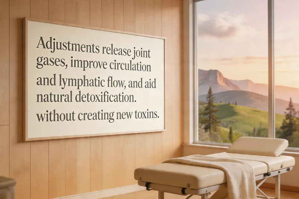 A chiropractic adjustment produces several physiologic responses that support overall health. First, the audible "pop" reflects joint gas release—nitrogen, oxygen, and carbon dioxide bubbles that collapse as the joint capsule expands, not a harmful toxin. Second, the brief, controlled movement of vertebrae improves circulation and lymphatic flow, facilitating metabolic by‑product clearance such as lactic acid and carbon dioxide that may have accumulated in surrounding tissues. This enhanced fluid dynamics also aids innate detoxification pathways, allowing the body to more efficiently eliminate low‑level environmental chemicals and metabolic waste. Safety considerations are paramount: clinicians screen for contraindications like fractures, severe osteoporosis, or acute neurologic deficits before manipulation, and they use gentle, patient‑specific forces to minimize tissue stress.