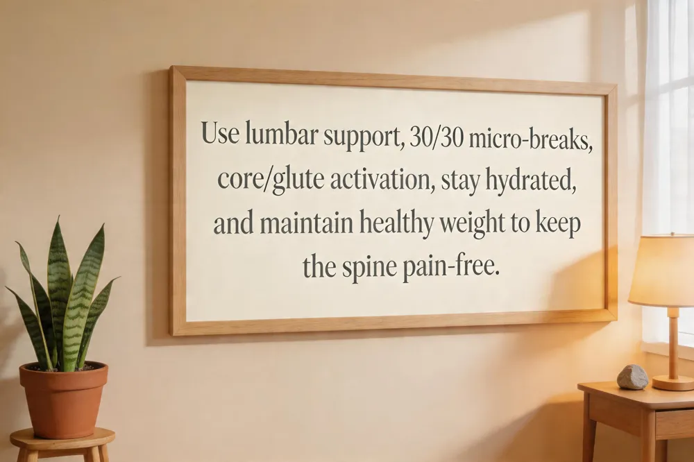 How to avoid lower back pain when working? Keep a neutral spine with lumbar support, take frequent micro‑breaks, strengthen core and glutes, lift using the legs, and adopt healthy weight and avoid smoking habits.