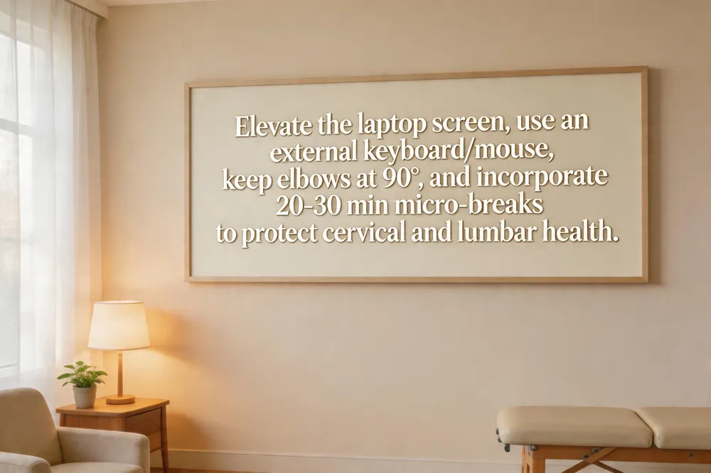 A laptop‑only setup often forces the user into a forward‑leaning posture that strains the cervical and lumbar spine. To achieve correct posture at a desk with a laptop, raise the screen with a stand or riser so the top edge sits at or just below eye level and the display is an arm’s length away; this eliminates the neck flexion that adds up to 10 kg of load per inch of forward head movement. Pair the laptop with an external keyboard and mouse placed directly in front of you, allowing elbows to stay close to the body at a 90‑degree angle, shoulders relaxed, and wrists neutral. Keep the feet flat on the floor (or on a footrest) and bend the knees so they are at a 90‑to‑120‑degree angle, with hips slightly higher than the knees to preserve the natural lumbar curve. Incorporate a movement cadence of a brief micro‑break every 20‑30 minutes—stand, walk, or perform seated cat‑cow, shoulder blade squeezes, and hip‑flexor stretches—to restore circulation, reduce muscle stiffness, and reinforce the neutral spine throughout the workday.