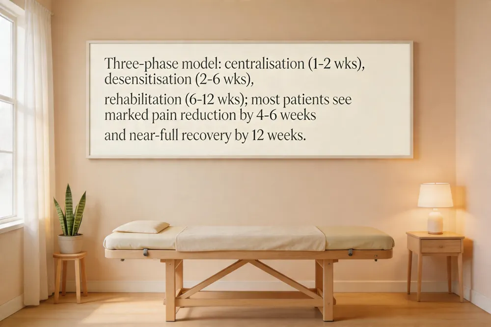 Sciatica recovery follows a three‑phase model: (1) Centralisation – pain moves from the lower leg back toward the hip and lower back, usually occurring in the first 1‑2 weeks; (2) Desensitisation – pain intensity and frequency decrease while the nerve becomes less irritable, spanning roughly weeks 2‑6; (3) Nerve Rehabilitation – strength, flexibility, and functional mobility return, often extending from week 6 through week 12. Typical duration of each phase varies, but most patients notice a marked reduction in pain by the end of the sub‑acute phase (≈4‑6 weeks) and achieve near‑full functional recovery by 12 weeks.