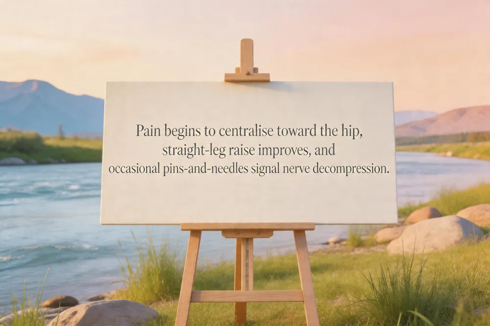 During weeks 3‑4 the sciatica repair process shifts from acute inflammation to the centralisation phase. Pain that once shot down the leg begins to recede toward the hip and lower back, a hallmark sign that the nerve is under less compression. At the same time, the intensity and frequency of radiating pain typically drop; coughing, sneezing, or prolonged sitting provoke far less discomfort than in the first two weeks. The straight‑leg‑raise test reflects this change as well—pain now appears at a higher degree of leg elevation (often beyond 30°), indicating reduced irritation of the sciatic root. Many patients also notice a pins‑and‑needles feeling, which the nerve is beginning to heal. While tingling can be a transient phenomenon during nerve adjustment, it is generally a positive signal when it accompanies other improvements.