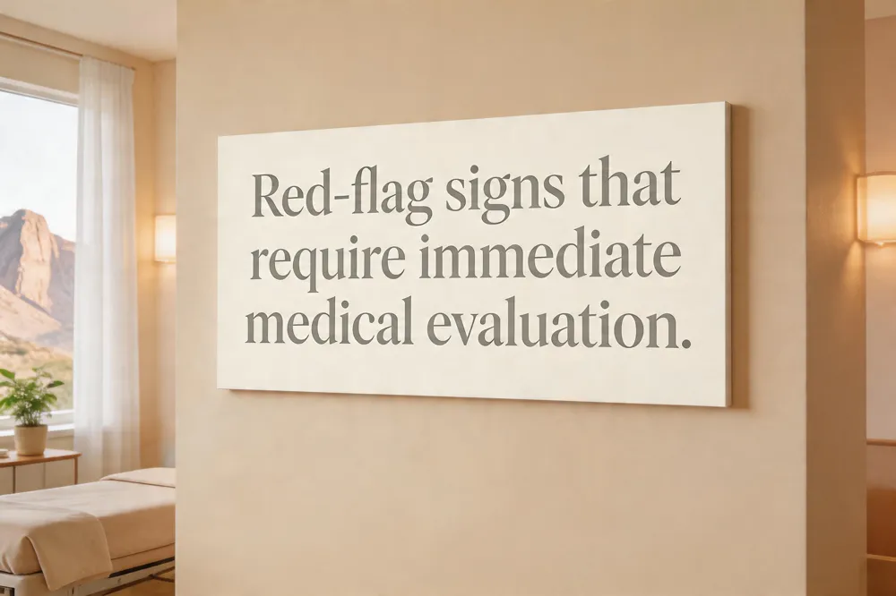 However, red‑flag symptoms such as severe, worsening pain, sudden loss of sensation or muscle strength, fever, chills, night sweats, or loss of bladder/bowel control require immediate medical evaluation by a physician to rule out cauda equina syndrome or other serious conditions. In these cases, imaging, medications, or surgical consultation may be necessary.
