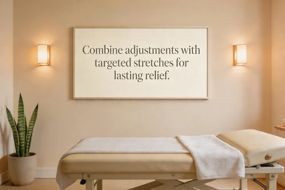 Professional adjustments are safest, but home self‑care can include Figure‑4, seated piriformis, and standing hamstring stretches—30 seconds each, 3‑5 reps per side. Avoid high‑impact or twisting motions. If pain worsens, schedule an in‑office chiropractic visit for a precise adjustment.