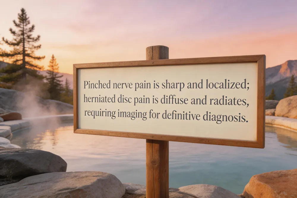 How to tell if it’s a pinched nerve or a herniated disc? A pinched nerve’s pain is sharp and localized, worsening with specific motions; a herniated disc’s pain is more diffuse, changes with posture, and often radiates down the limb. Imaging is required for definitive distinction.