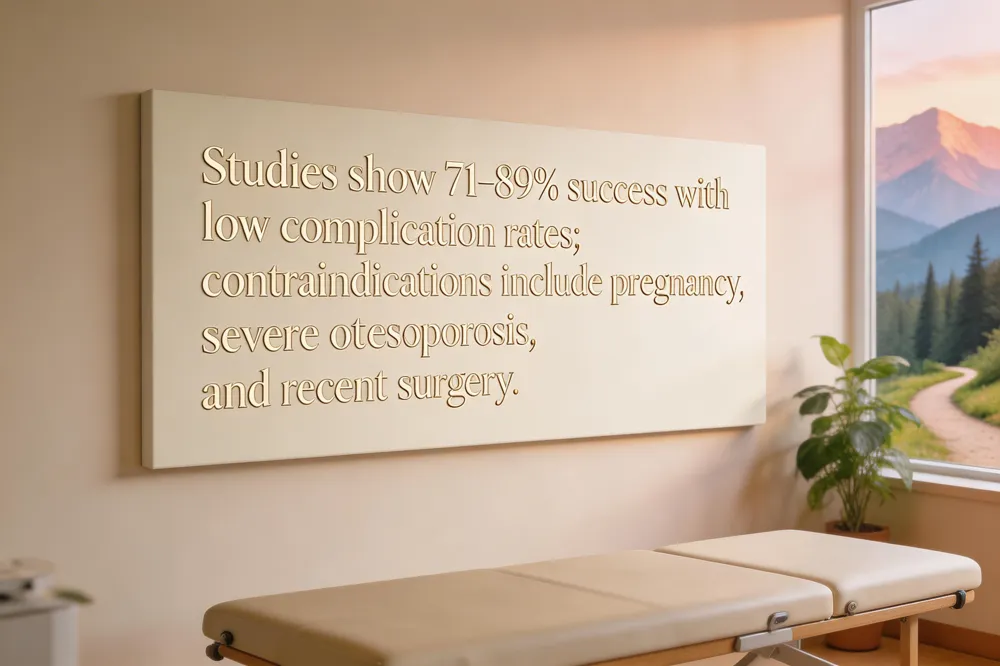 Safety data indicate a favorable profile when contraindications are respected. Common mild side effects include transient soreness, fatigue, or brief increases in pain; serious complications are rare. Contraindications comprise pregnancy, severe osteoporosis, acute fractures, spinal tumors, recent surgery, and uncontrolled hypertension. Patients should be screened with imaging and a thorough history before initiation.