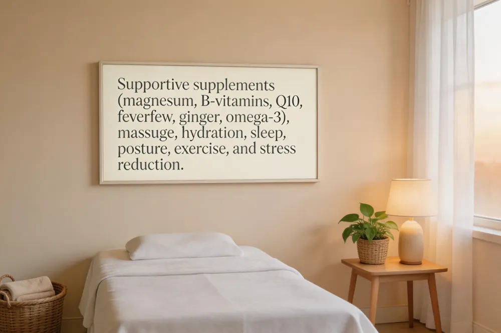 Evidence‑based natural supplements can play a supportive role in headache management. Magnesium (especially oxide or glycinate), vitamin B12 and other B‑vitamins such as riboflavin (vitamin B2), coenzyme Q10, feverfew, ginger, and omega‑3 fatty acids have been shown to reduce headache frequency and severity by stabilizing mitochondrial energy, lowering inflammation, and improving vascular tone. Massage therapy is another effective non‑pharmacologic tool; targeted neck, shoulder, and scalp massage relaxes tight muscles that trigger tension‑type headaches, enhances blood flow, and can lessen migraine intensity. Regular therapist‑guided sessions have been linked to fewer headache days, reduced anxiety, and better sleep quality. Lifestyle habits that amplify chiropractic outcomes include consistent hydration, adequate sleep (7–9 hours), ergonomic posture, regular low‑impact aerobic activity, and stress‑reduction practices such as yoga or mindfulness meditation. Together, these strategies create a holistic, patient‑centered plan that maximizes spinal health, nerve function, and overall well‑being.