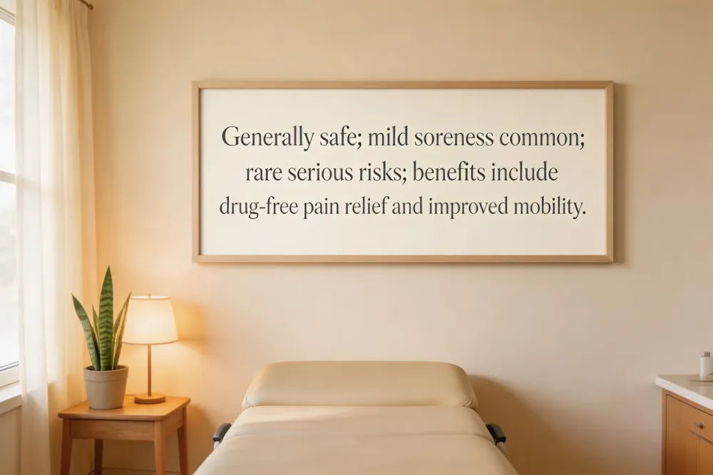 Chiropractic adjustments are generally safe for most adults when performed by a licensed practitioner. The most common side effects after a session are mild muscle or joint soreness, a brief increase in pain, fatigue, or a short‑lasting headache that usually resolves within 24‑48 hours. Rare serious complications—such as worsening a herniated disc, nerve compression, or vertebrobasilar stroke—are extremely uncommon and are avoided in patients with severe osteoporosis, spinal cancer, or other high‑risk conditions. Compared with other medical visits, the overall injury risk from spinal manipulation is lower; studies show a hazard ratio of about 0.24 for older adults after a chiropractic visit versus primary‑care care. Benefits include drug‑free pain relief, improved mobility, enhanced nervous‑system function, and preventive support for sports or chronic conditions. Disadvantages are the occasional temporary soreness, rare nerve irritation, and the need to avoid high‑velocity neck thrusts in certain populations. Proper screening, hydration, and brief post‑adjustment rest help minimize mild reactions, and any persistent symptoms should prompt a follow‑up call to the chiropractor.