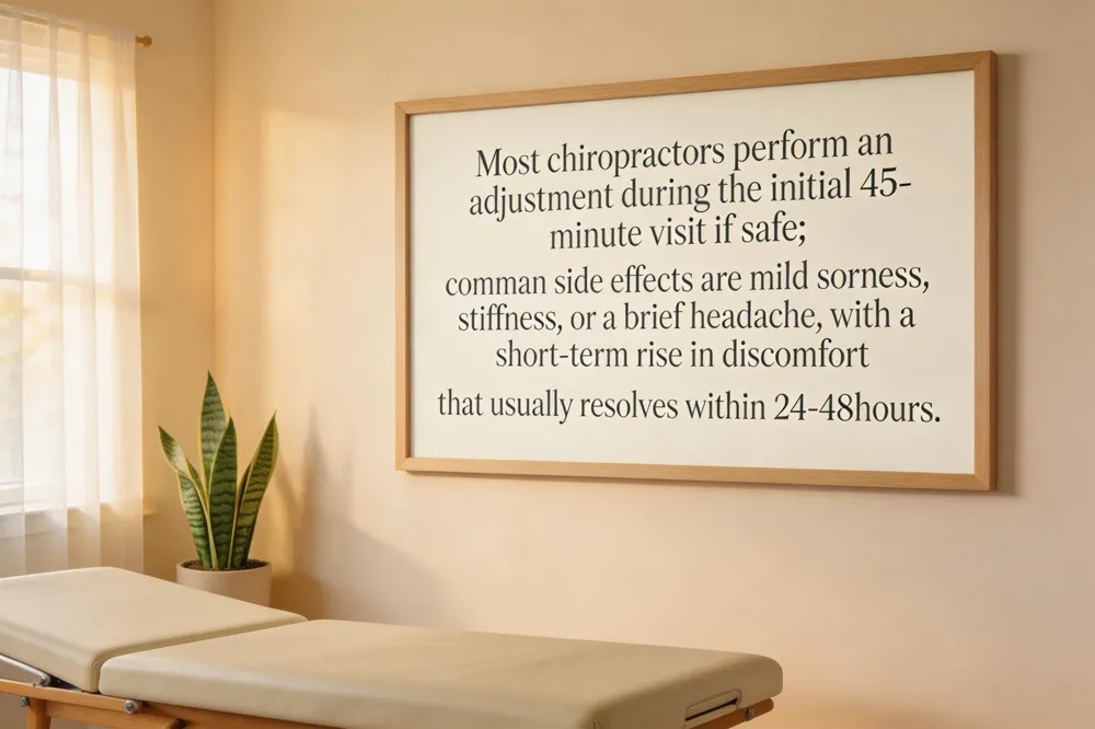 Most chiropractors will perform an adjustment during the initial 45‑minute consultation once the history and exam are completed. If the practitioner judges the adjustment safe and appropriate—based on posture, range‑of‑motion, neurological checks, and any needed imaging—it is often done immediately using gentle hands‑on or instrument‑assisted techniques. When red‑flag signs or further imaging are required, the adjustment may be scheduled for a later visit.